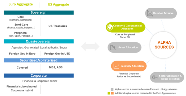 Creemos que este es uno de los puntos fuertes de la renta fija en euros; a diferencia de otras regiones, la renta fija en euros tiene más de una curva soberana, lo que brinda la oportunidad de posicionarse donde sea más apropiado. Como se ilustra a continuación, los mercados de bonos denominados en euros, en comparación con EE. UU., ofrecen una diversificación única dentro de un segmento de renta fija mundial gracias a una amplia selección de fuentes de alfa.