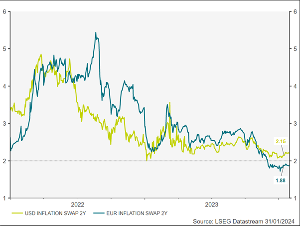 Esperamos que la inflación se normalice este año, aunque la cuestión de si se normalizará en el objetivo del 2% de los bancos centrales es más incierta. Aunque ha caído en comparación con la misma época del año pasado, las cifras de inflación general siguen siendo persistentes por encima del 2%: en diciembre, en Estados Unidos fue del 3,4% y en la zona euro del 2,9%.