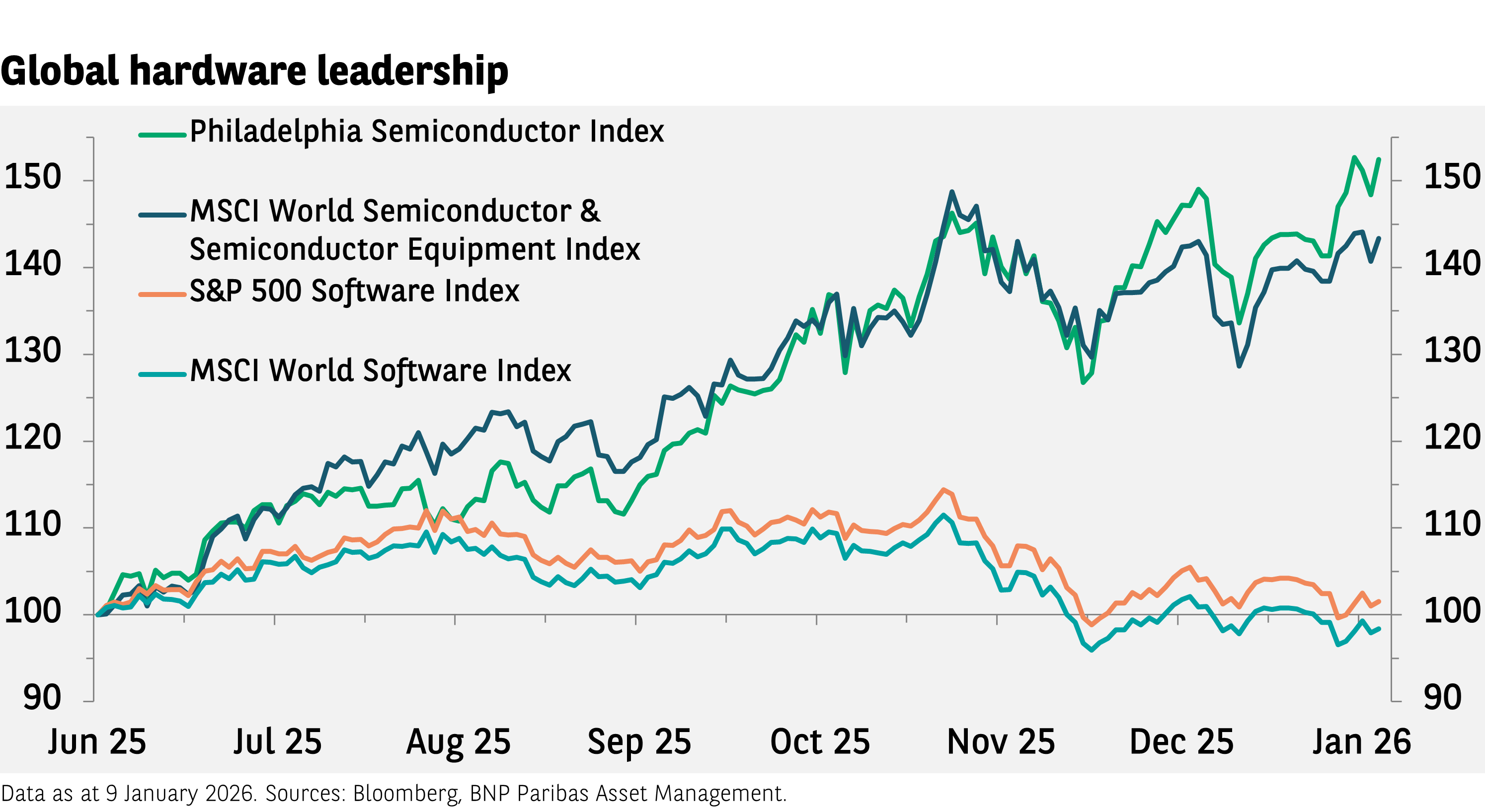 El reciente rally de las acciones tecnológicas, tanto en Estados Unidos como en otros países, ha estado impulsado no tanto por las empresas que desarrollan tecnologías básicas de inteligencia artificial (IA), sino más bien por las denominadas empresas de «picos y palas», es decir, las proveedoras de la infraestructura y las herramientas esenciales que respaldan el crecimiento de la IA. Entre ellas se encuentran los fabricantes de semiconductores, los proveedores de hardware y los proveedores de plataformas de computación en la nube, y se espera que todas ellas se beneficien del aumento del gasto de capital asociado al desarrollo de la IA.