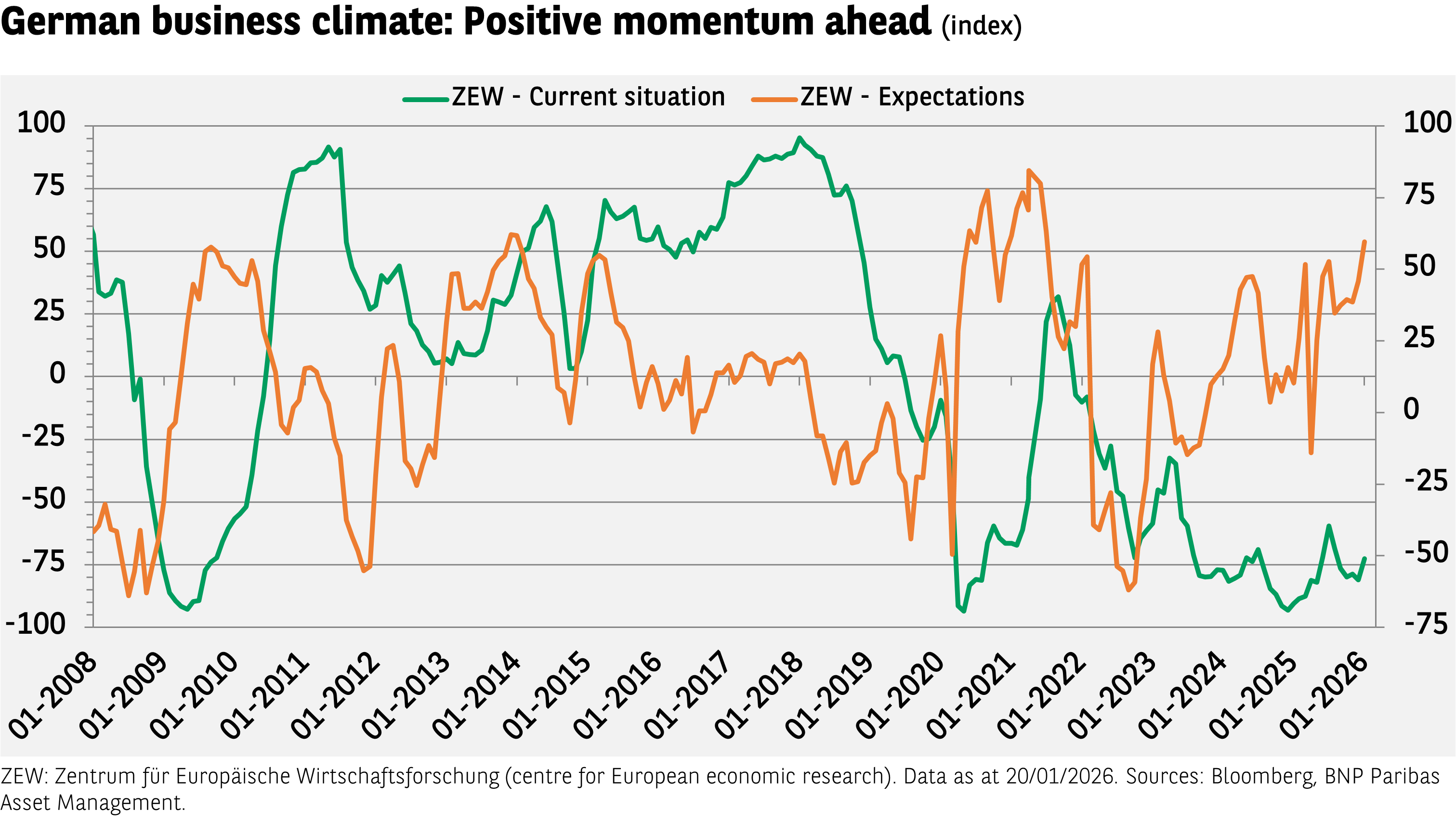 El indicador ZEW de confianza económica, una encuesta realizada a analistas financieros e inversores alemanes, subió notablemente en enero hasta alcanzar su nivel más alto desde julio de 2021. Este aumento augura un «nuevo dinamismo», impulsado por los planes de gasto masivo en infraestructuras y defensa de Alemania. Los pedidos están aumentando y la producción industrial a finales de 2025 fue considerablemente superior a lo previsto. La valoración de la situación económica actual también mejoró, aunque de forma más modesta, pero no por ello menos alentadora. ¿Es hora de confiar más en el potencial de Alemania?