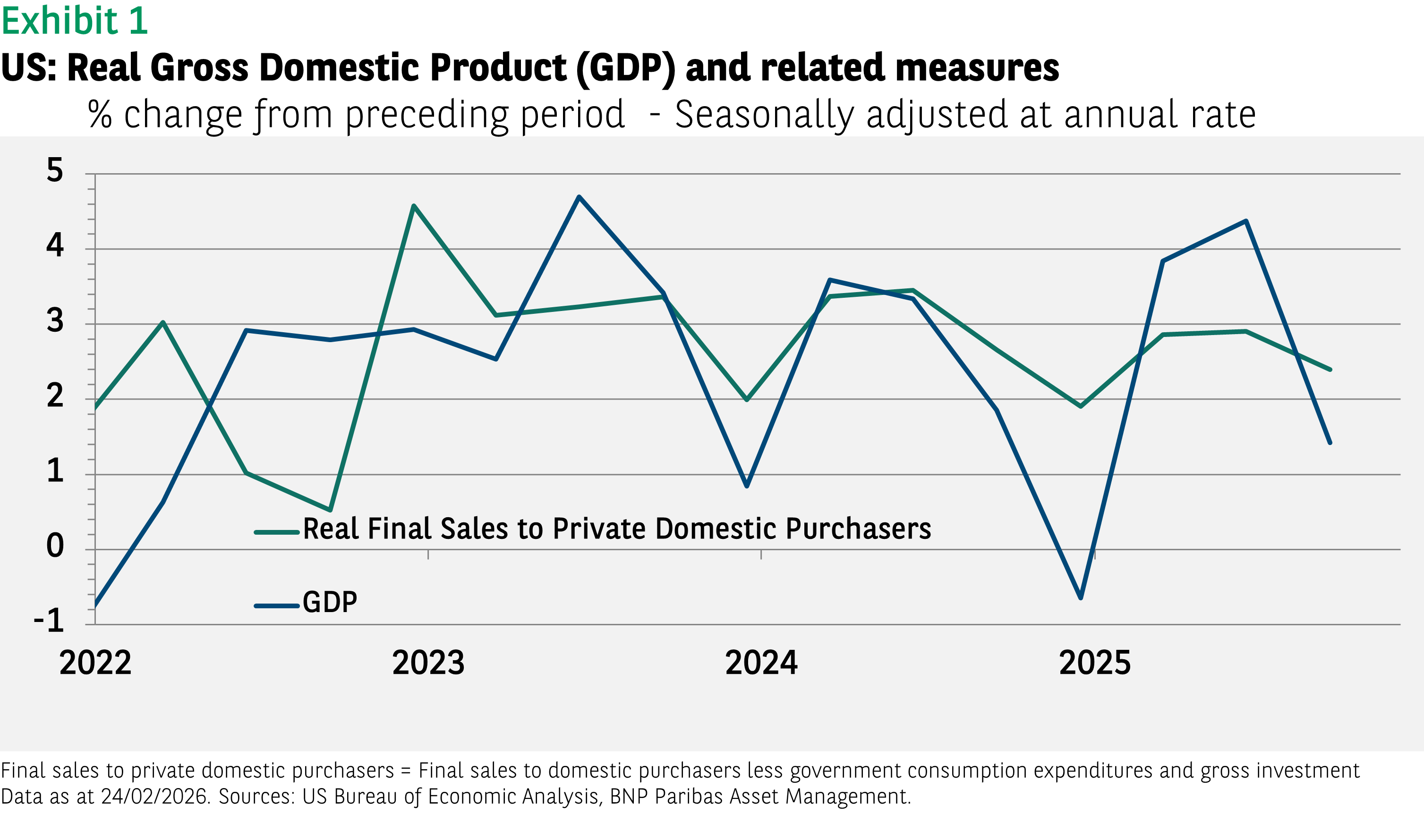 El crecimiento del PIB estadounidense del cuarto trimestre se situó en el 1,4% (tasa anual desestacionalizada), según la última estimación adelantada. Esto supuso tanto una desaceleración con respecto al 4,4% del tercer trimestre como una decepción en comparación con las estimaciones de consenso. Sin embargo, los datos subyacentes fueron más alentadores. En primer lugar, el menor consumo y gasto del gobierno federal, debido al cierre parcial del mismo, supuso un lastre considerable para el crecimiento trimestral del PIB (-0,9 puntos porcentuales). En segundo lugar, las ventas finales a compradores privados nacionales han sido mucho menos volátiles que el PIB. La demanda nacional privada (consumo más inversión) se ha mantenido en torno al 2,5% durante los dos últimos años, lo que destaca la resiliencia del crecimiento estadounidense.
