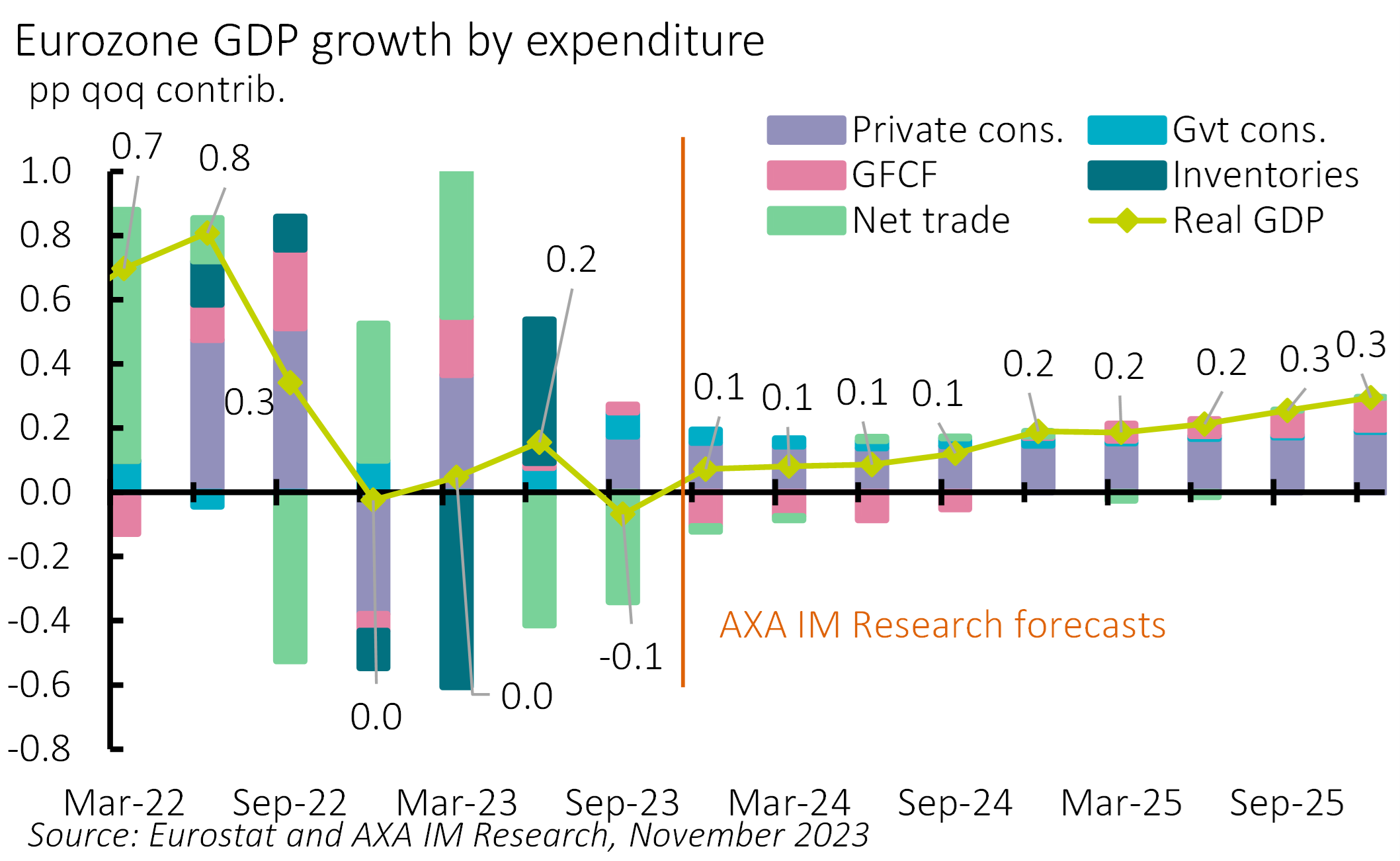 Eurozone GDP growth contracted slightly in Q3 following continued business surveys weakness since the spring. They remain stuck in low gear, implying a technical recession in the second half of 2023 cannot be ruled out. However, we believe a further inflation decline will generate marked real purchasing power gains in Q4 – exceeding 2% above pre-Ukraine conflict levels (Q4 2021) – supporting private consumption. Overall, we project Eurozone GDP to grow by 0.5% in 2023.